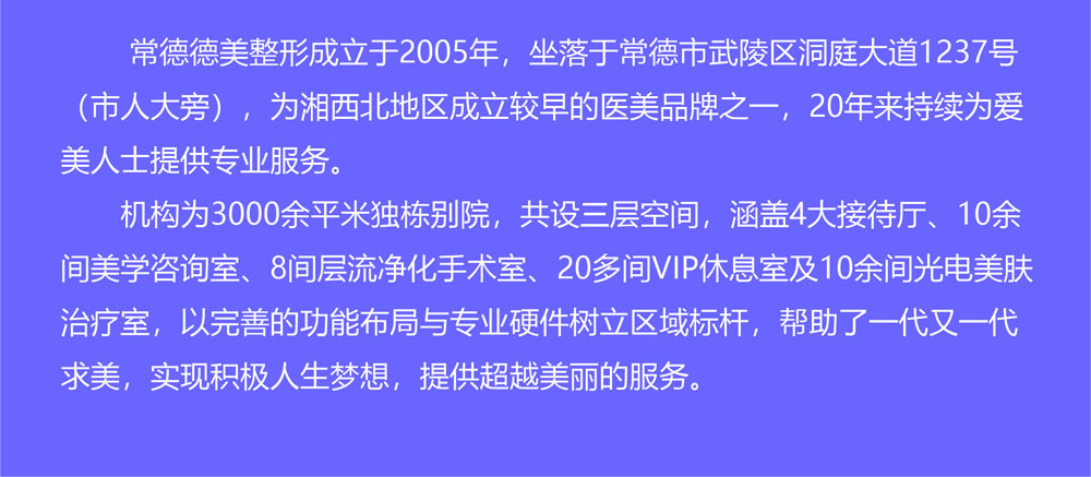 常德德美整形成立于2005年,坐落于常德市武陵区洞庭大道1237号(市人大旁),为湘西北地区成立较早的医美品牌之一,20年来持续为爱美人士提供专业服务。 机构为3000余平米独栋别院,共设三层空间,涵盖4大接待厅、10余间美学咨询室、8间层流净化手术室、20多间VIP休息室及10余间光电美肤治疗室,以完善的功能布局与专业硬件树立区域标杆,帮助了一代又一代求美,实现积极人生梦想,提供超越美丽的服务,