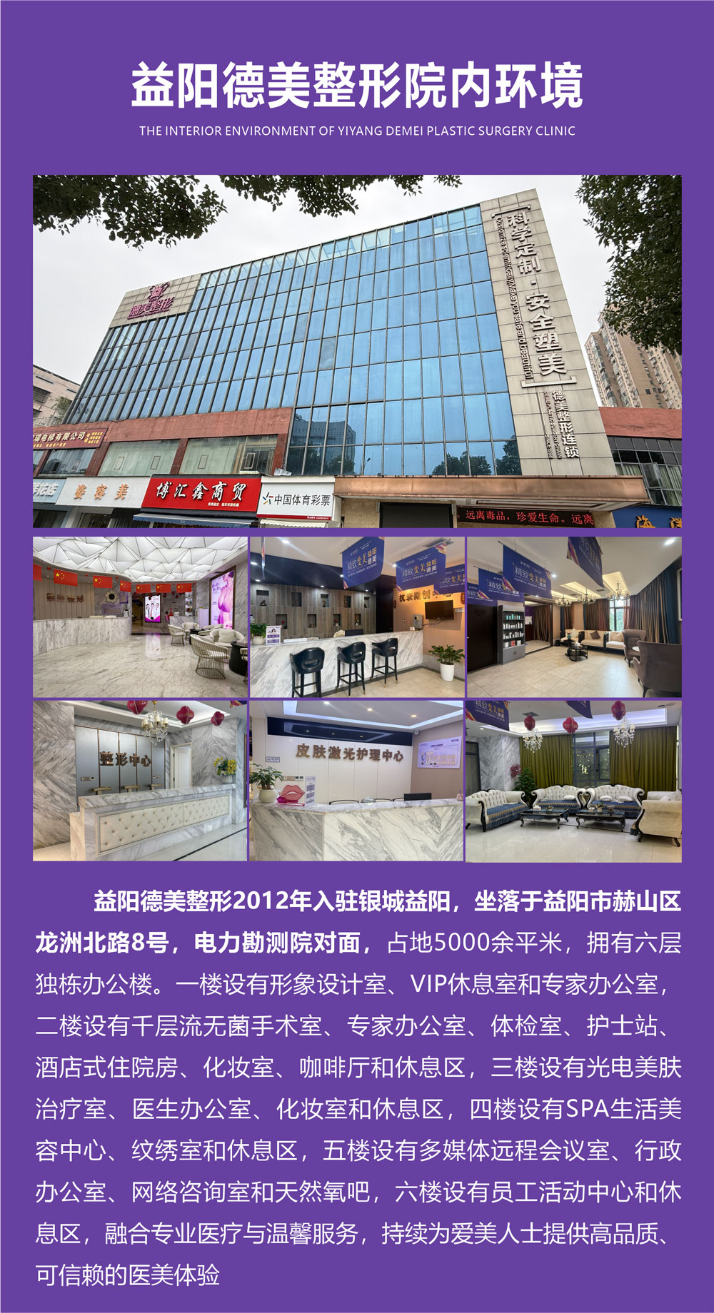 益阳德美整形2012年入驻银城益阳,坐落于益阳市赫山区龙洲北路8号,电力勘测院对面,占地5000余平米,拥有六层独栋办公楼。一楼设有形象设计室、VIP休息室和专家办公室,二楼设有千层流无菌手术室、专家办公室、体检室、护士站、酒店式住院房、化妆室、咖啡厅和休息区,三楼设有光电美肤治疗室、医生办公室、化妆室和休息区,四楼设有SPA生活美容中心、纹绣室和休息区,五楼设有多媒体远程会议室、行政办公室、网络咨询室和天然氧吧,六楼设有员工活动中心和休息区,融合专业医疗与温馨服务,持续为爱美人士提供高品质、可信赖的医美体验。